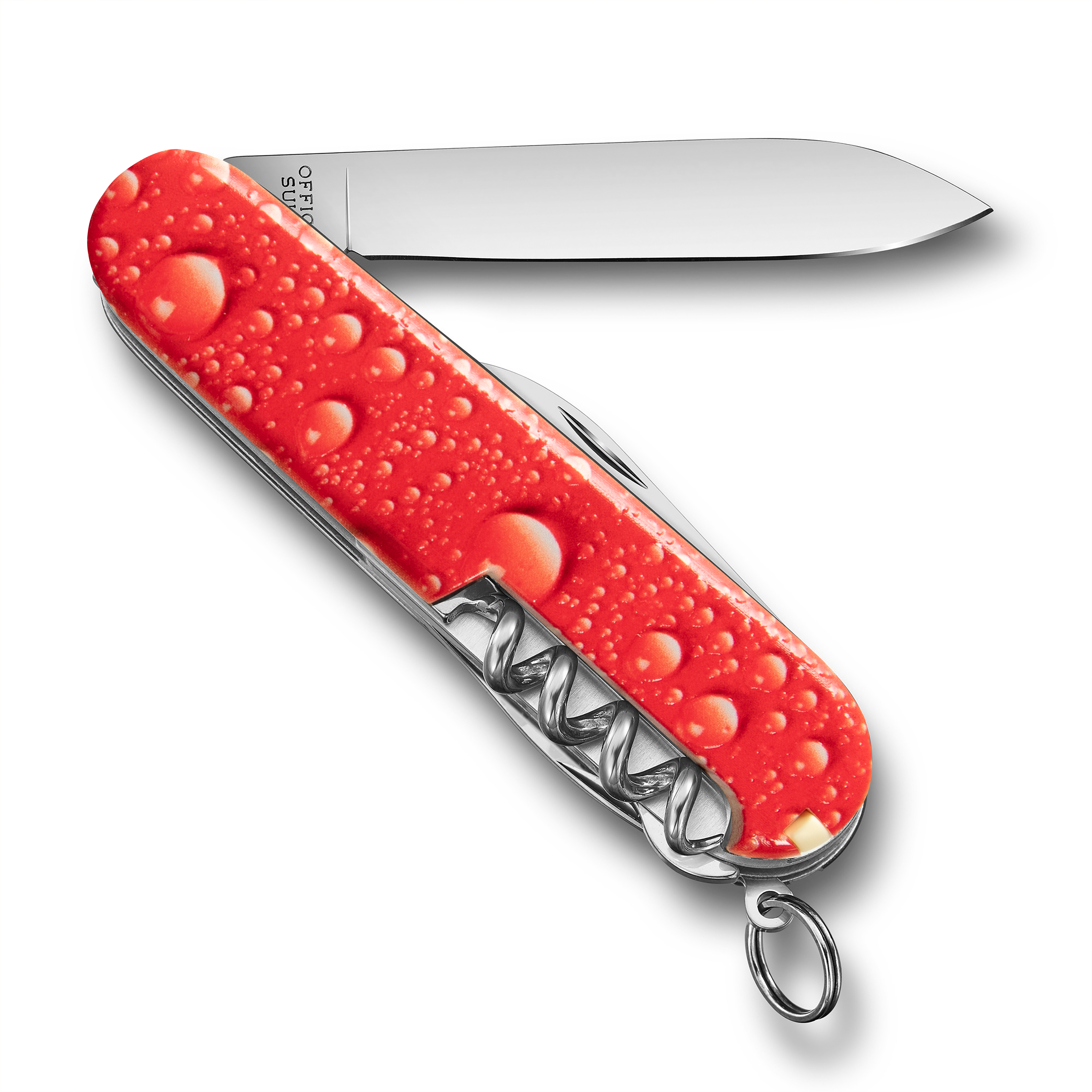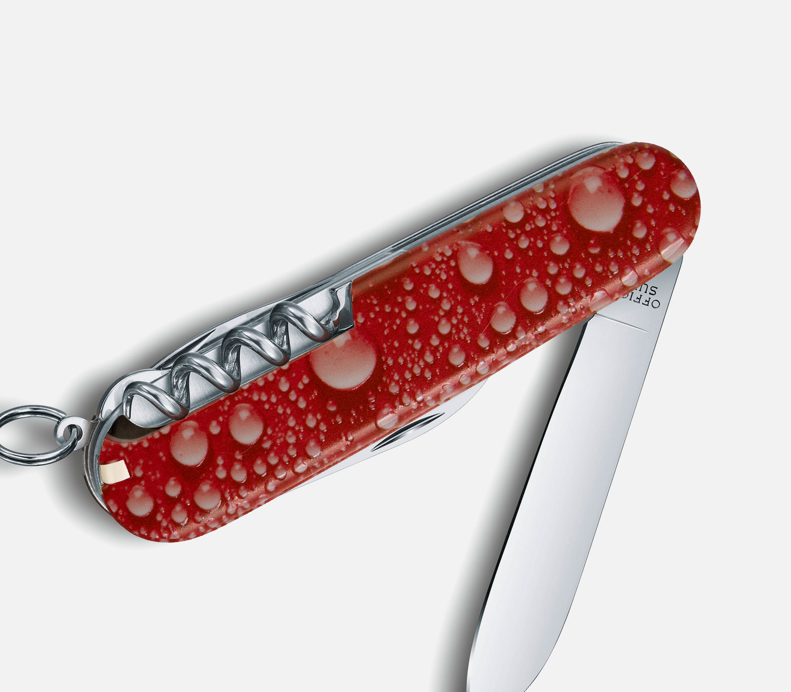 Das Sackmesser Climber Rainbow Bubbles Erdbeere wurde mit einer speziellen Struktur auf der Schale behandelt. Diese ist mit der Hand fühlbar. Es gehört daher zu den "Touch & Feel" Taschenmessern und ist mit seinen verschiedenen Farbvarianten bei uns im Laden sehr beliebt. Der 3D-Druck, welcher die Oberfläche wie Wassertropfen erscheinen lässt, gab dem Messer den speziellen Namen "Bubbles".