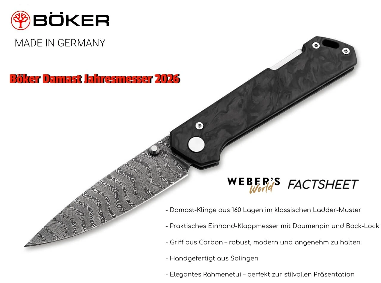 Es gibt Hersteller, bei denen wir einfach wissen, dass jeder Launch zum absoluten Highlight wird. Genau das trifft auf Böker zweifelsfrei zu. Die stolze Manufaktur aus Solingen bringt endlich ihr neues Damast Jahresmesser raus. 2026 erwartet dich ein ikonischer Kracher mit edlem Design. Sichere es dir direkt bei uns!