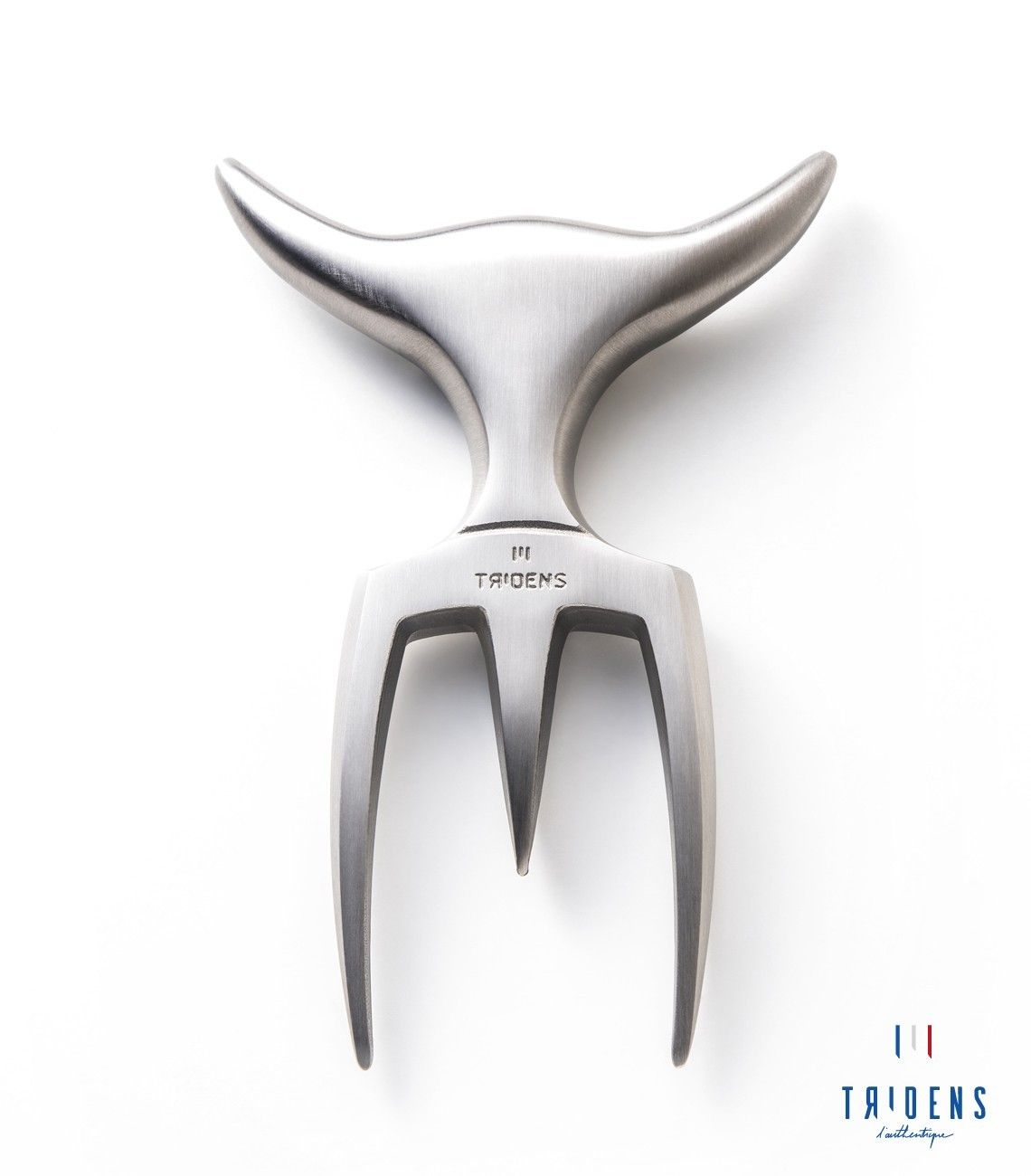 Die zwei Hörner deuten es schon an, diese stählerne Wucht ist nicht zu bremsen. Man bekommt fast das Gefühl, als würde sie ungeduldig auf ihren Einsatz warten. Der kreative Designer dieses animalischen Tools ist Michel Chaillou, ein bekannter Professor der Hochschule für Design in Nantes. Hergestellt aus unverwüstlichem rostfreiem 316L Stahl, wird die Tridens Fleischgabel zu einer echten Diva der Handwerkskunst. Ihre beeindruckende Form macht sie für Links- und Rechtshänder gleichermassen interessant! Hast du sie am Grill fest in der Hand, so ziehst du nicht nur alle Blicke auf dich, sondern signalisierst deinem Fleisch klar: Ich hab hier das Sagen! Alle werden wissen wollen, woher du dieses unglaubliche Teil hast. Worauf also noch warten? Lerne den Bullen zu zähmen...