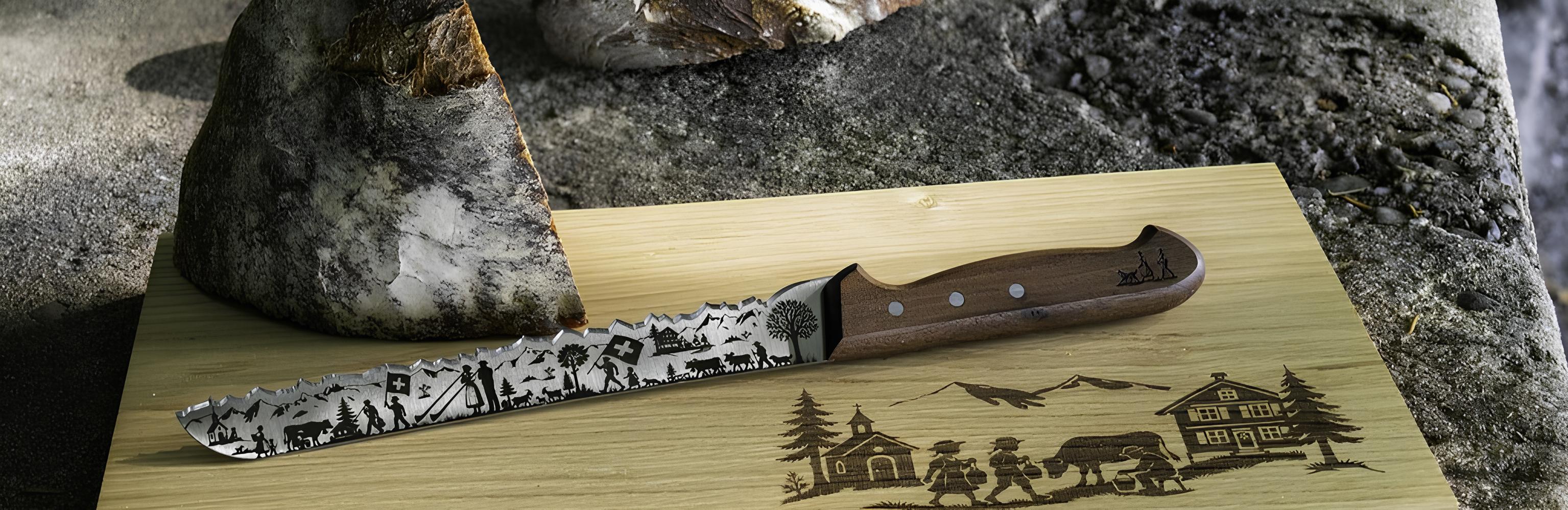 Aus Liebe zu den Bergen entstand das Panorama Knife. Es begann mit einer einfachen Idee: Das Panorama einer Bergkette auf der Klinge eines Messers abzubilden und mit Namen und Höhen der Berge zu versehen. Die Messer werden im Bergell im Kanton Graubünden mehrheitlich in Handarbeit produziert.