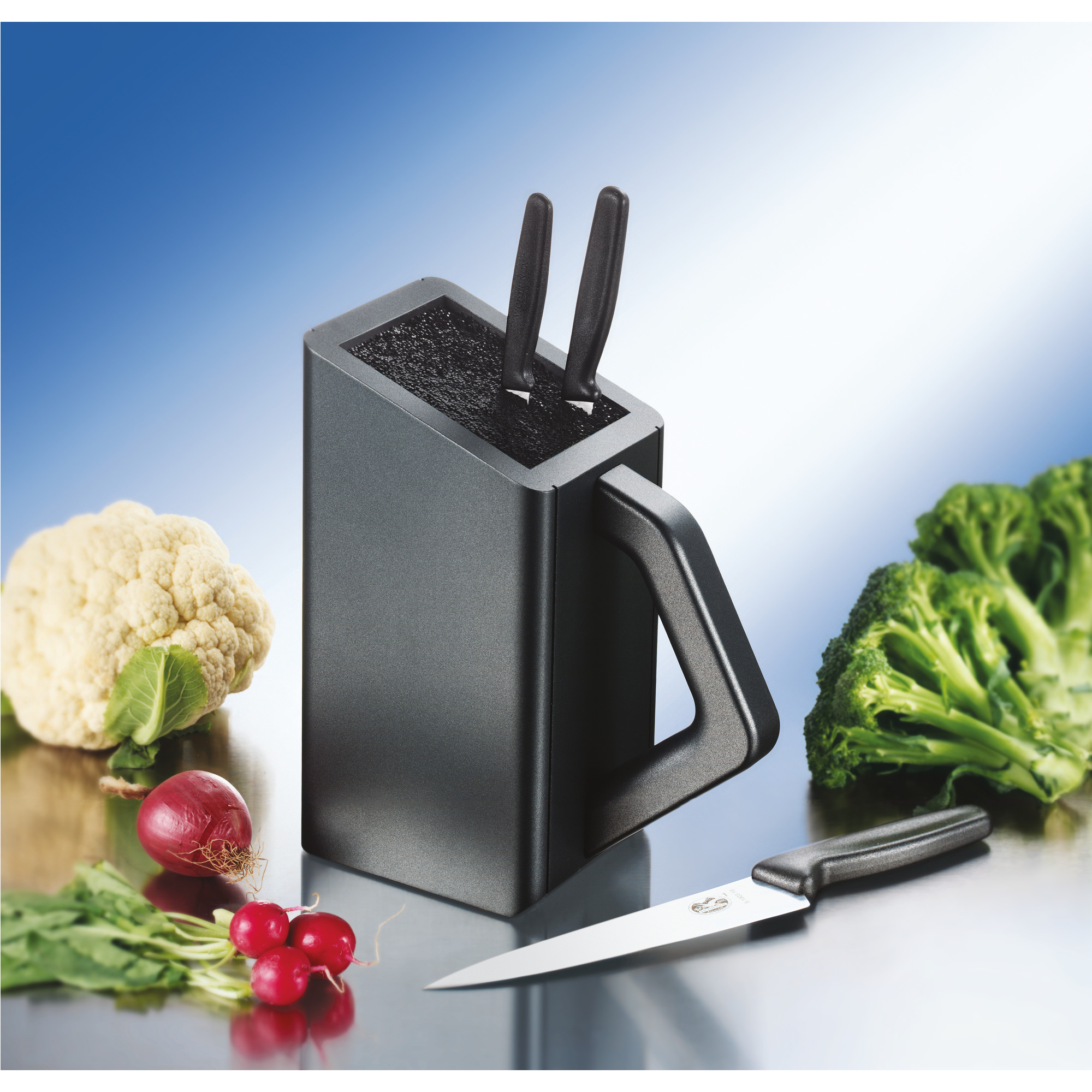 Der leere Victorinox Grand Maître Messerblock in edlem Schwarz transportiert dich direkt in Welten der kulinarischen Exzellenz! Mit einem Gewicht von knapp 1.5 kg präsentiert sich dieser Block als Inbegriff von robuster Qualität und zeitloser Eleganz. Abhängig von der Grösse und Form der Werkzeuge, die du verstauen möchtest, bietet der Block Platz für ungefähr 6 Messer und Küchenutensilien in verschiedensten Längen und Schliffen. All deine geliebten Küchenutensilien, welche deine Küchenschublade bewohnen und sich nach einem festen Aufbewahrungsplatz sehnen, haben hiermit ihr Zuhause gefunden! Der leere Victorinox Grand Maître Messerblock ist nicht nur essenziell für Küchenfanatiker und Ordnungsliebhaber, sondern auch eine perfekte Geschenkidee, um die Leidenschaft fürs organisierte Kochen mit den Liebsten zu teilen! Für diejenigen, die ganz frisch starten wollen, ist der Victorinox Grand Maître Messerblock auch mit einem inkludierten 6-teiligen geschmiedeten Messer-Set verfügbar.