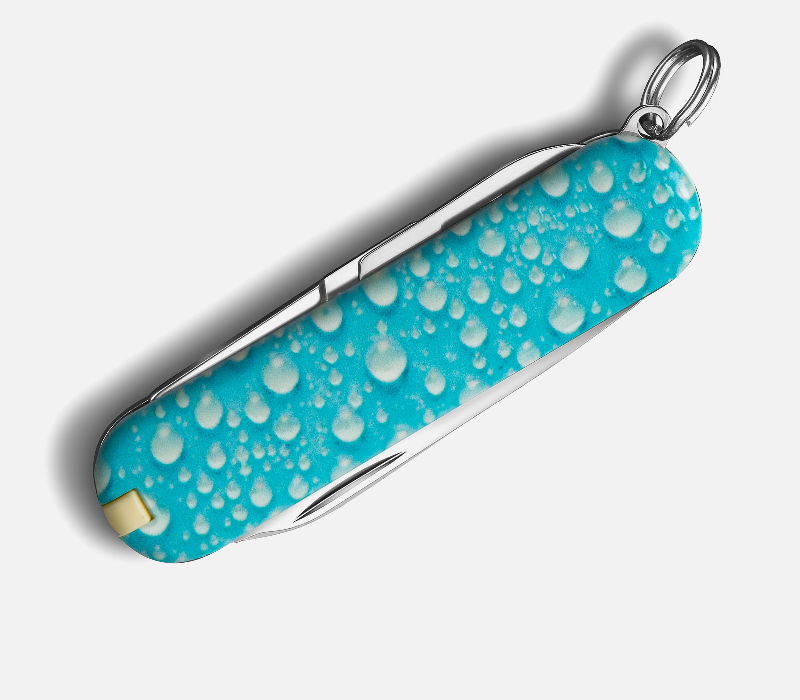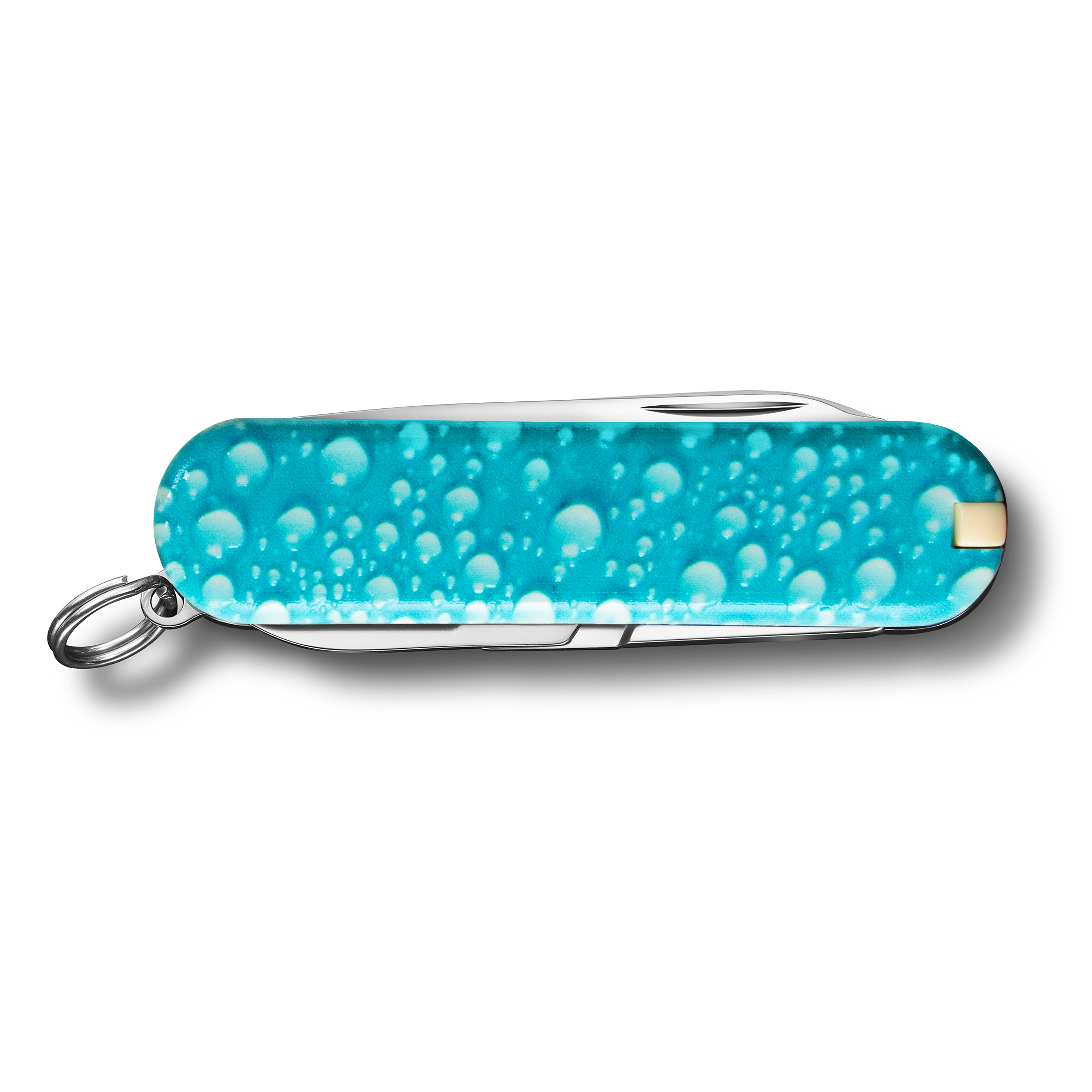 Das Sackmesser Classic Nature Bubbles hellblau wurde mit einer speziellen Struktur auf der Schale behandelt. Diese ist mit der Hand fühlbar. Es gehört daher zu den "Touch & Feel" Taschenmessern und ist mit seinen verschiedenen Farbvarianten bei uns im Laden sehr beliebt. Der 3D-Druck, welcher die Oberfläche wie Wassertropfen erscheinen lässt, gab dem Messer den speziellen Namen "Bubbles".