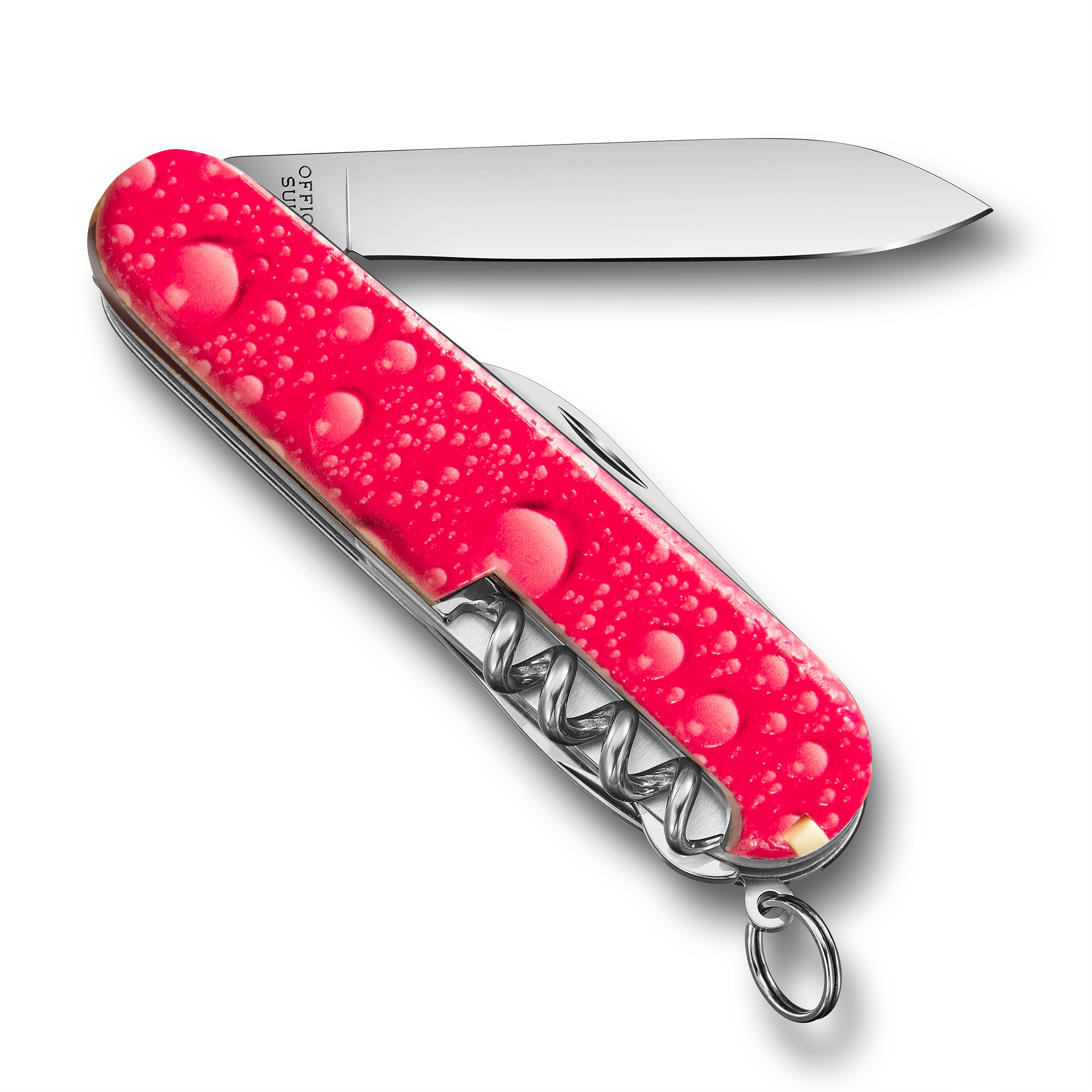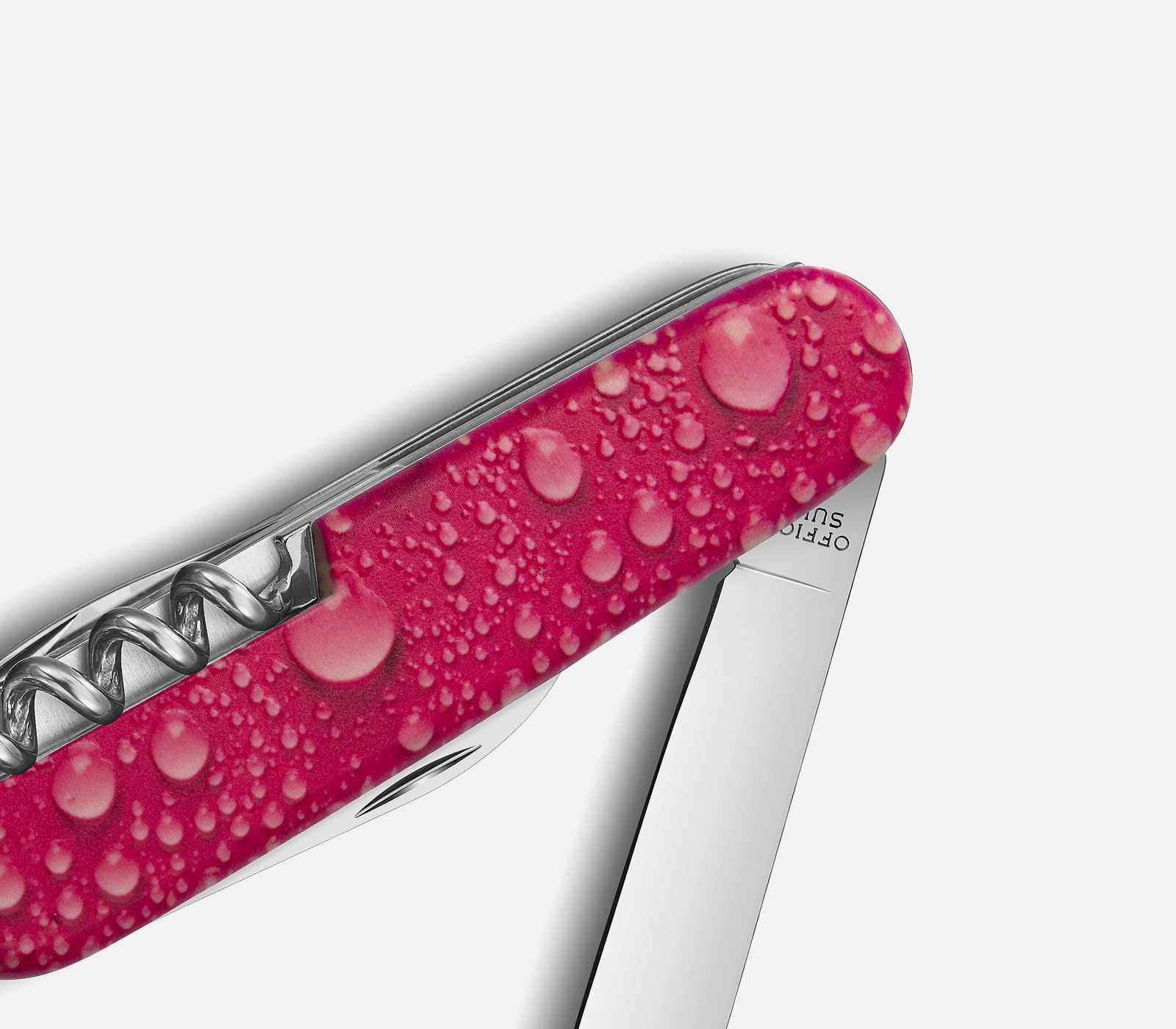 Das Sackmesser Climber Rainbow Bubbles pink wurde mit einer speziellen Struktur auf der Schale behandelt. Diese ist mit der Hand fühlbar. Es gehört daher zu den "Touch & Feel" Taschenmessern und ist mit seinen verschiedenen Farbvarianten bei uns im Laden sehr beliebt. Der 3D-Druck, welcher die Oberfläche wie Wassertropfen erscheinen lässt, gab dem Messer den speziellen Namen "Bubbles".