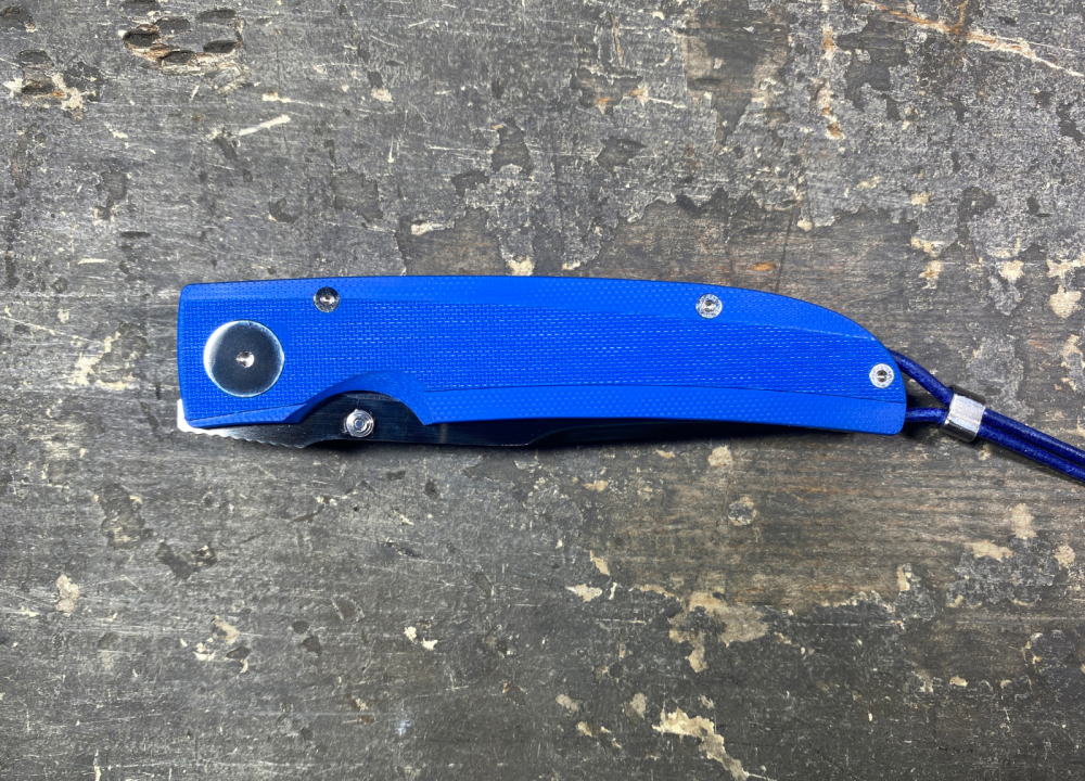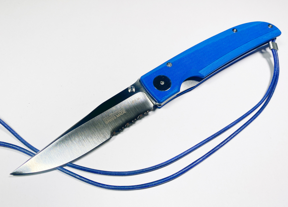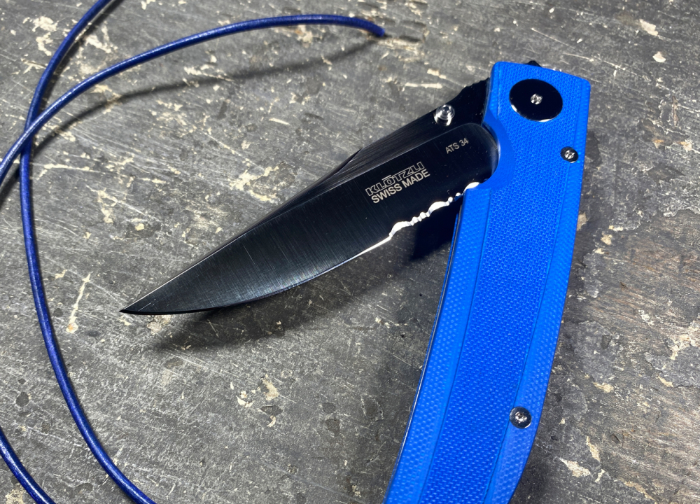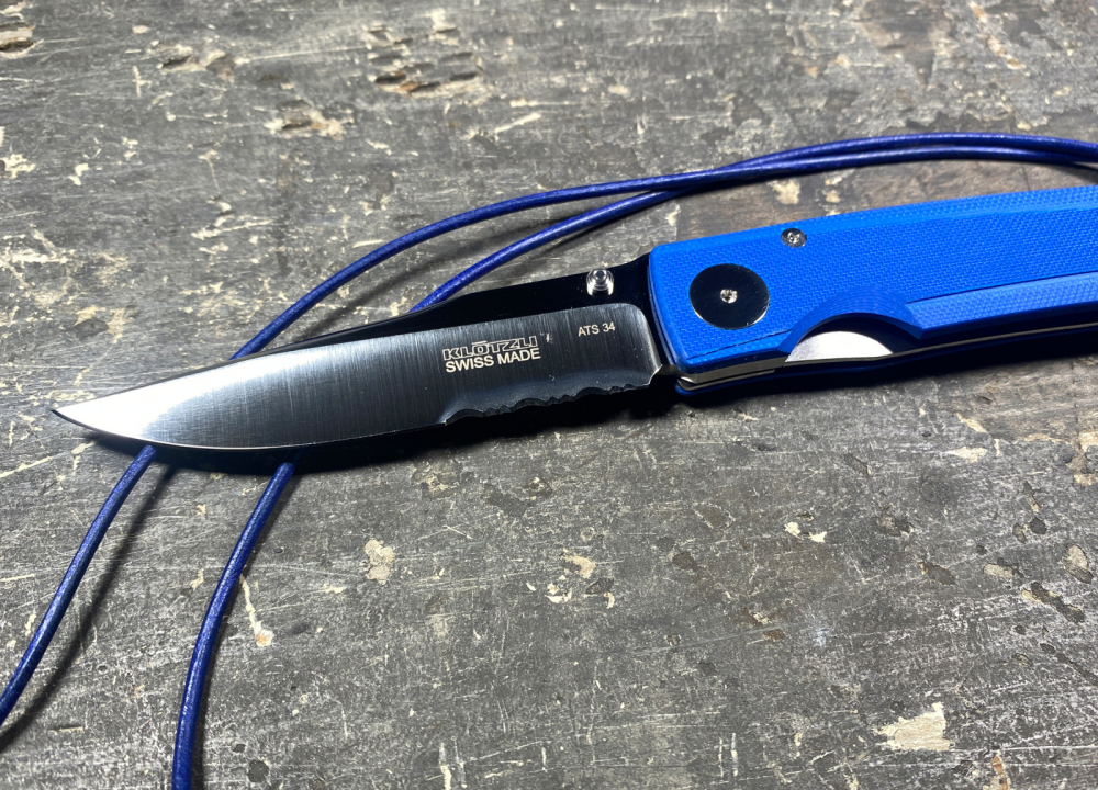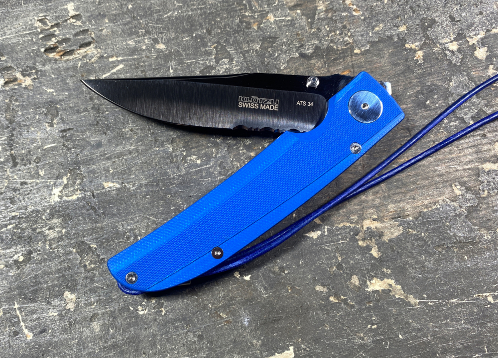 Wie auch das Klötzli Walker 03 Blau ist das Klötzli Walker 03 Blau Welle ein Klappmesser mit Feststellklinge aus dem Hause der Messerschmiede Klötzli. Es wurde designt von Michael Walker, dem Erfinder des LinerLock Klappmessers. Es besteht aus einer blauen G-10 Beschalung und einem rückseitigen Clip. Nebst dem Clip ist am Griffende auch ein Lederband in blau befestigt. Die Schalen selbst wurden auf der Oberfläche unterschiedlich gefräst und durch eine hochglanzpolierte Hauptschraube sowie eine polierte Feder Kante modifiziert. Selbst wenn das Messer mal nass werden sollte, bietet das G10 des Griffes einen besonders guten Halt und ist zugleich praktisch und zuverlässig. Der Liner besteht aus Titanstahl während die Klinge aus einem ATS-34 Stahl (hoher Kohlenstoffanteil ermöglicht Härte bis zu 60 HRC) geschliffen wird, im Unterschied zum Bruder "Walker 03" aber mit einer Teilwelle im hinteren Bereich der Klinge. Wie auch die weiteren Messer von Klötzli ist auch dieses natürlich in Handarbeit und mit Qualitätskontrolle vom Anfang bis zum Schluss gefertigt worden.