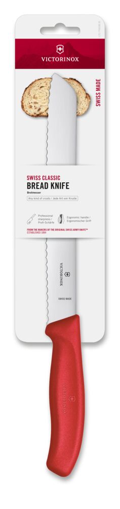 Das Victorinox Swiss Classic Brotmesser eignet sich für alle, vom Bäcker bis zum «Zmorge»-Liebhaber, und macht das Schneiden von jeglichem Brot zum reinsten Vergnügen. Mit seiner scharfen, 21 cm langen Klinge aus rostfreiem Stahl und dem präzisen Wellenschliff, welcher den Teig problemlos aufreisst, meistert das Brotmesser alles mit Leichtigkeit – ob knuspriges Baguette, saftiges Vollkornbrot oder luftiges Croissant. Der Griff verleiht dem Messer eine komfortable Haptik und es ist spülmaschinengeeignet. Erhältlich ist dieses Messer in drei tollen Farben. Dieses Brotmesser verwandelt deine Brotzeit garantiert in ein wahres Genusserlebnis!