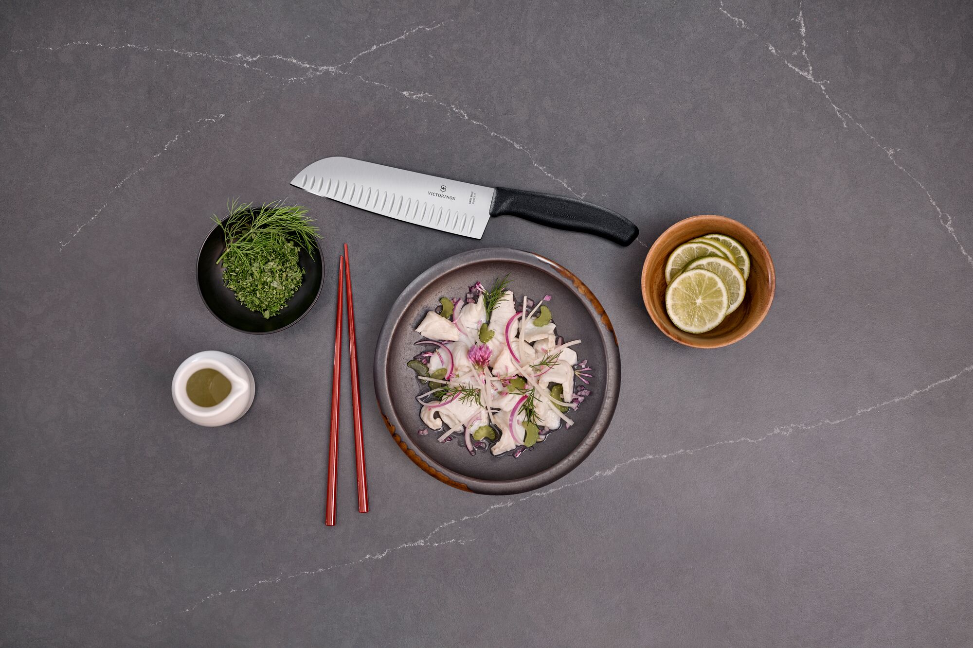 Das Victorinox Swiss Classic Santokumesser von Victorinox ist perfekt geeignet für diejenigen mit einer breiten Geschmackspalette und einer besonders ausgeprägten Liebe zur Präzision und Effizienz. Der Griff hat eine ergonomische Passform für besten Komfort. Die 17cm Klinge des Swiss Classic Santokumessers beherrscht das Schneiden, Hacken und Würfeln von Fleisch, Fisch und Gemüse – also so ziemlich alles. Dafür steht «Santoku», japanisch für «drei Tugenden», schliesslich auch! Dazu kommt ein Kullenschliff auf der Klinge, damit dein Schneidgut nicht am Messer kleben bleibt. Hole dir jetzt bei uns den Alleskönner für deine Küche und hebe deine kulinarischen Abenteuer auf ein neues Level!