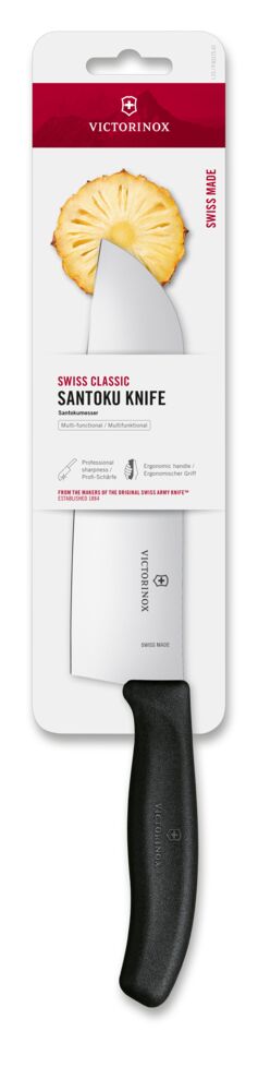 Das Victorinox Swiss Classic Santokumesser von Victorinox ist perfekt geeignet für diejenigen mit einer breiten Geschmackspalette und einer besonders ausgeprägten Liebe zur Präzision und Effizienz. Der Griff hat eine ergonomische Passform für besten Komfort. Die 17cm Klinge des Swiss Classic Santokumessers beherrscht das Schneiden, Hacken und Würfeln von Fleisch, Fisch und Gemüse – also so ziemlich alles. Dafür steht «Santoku», japanisch für «drei Tugenden», schliesslich auch! Hole dir jetzt bei uns den Alleskönner für deine Küche und hebe deine kulinarischen Abenteuer auf ein neues Level!